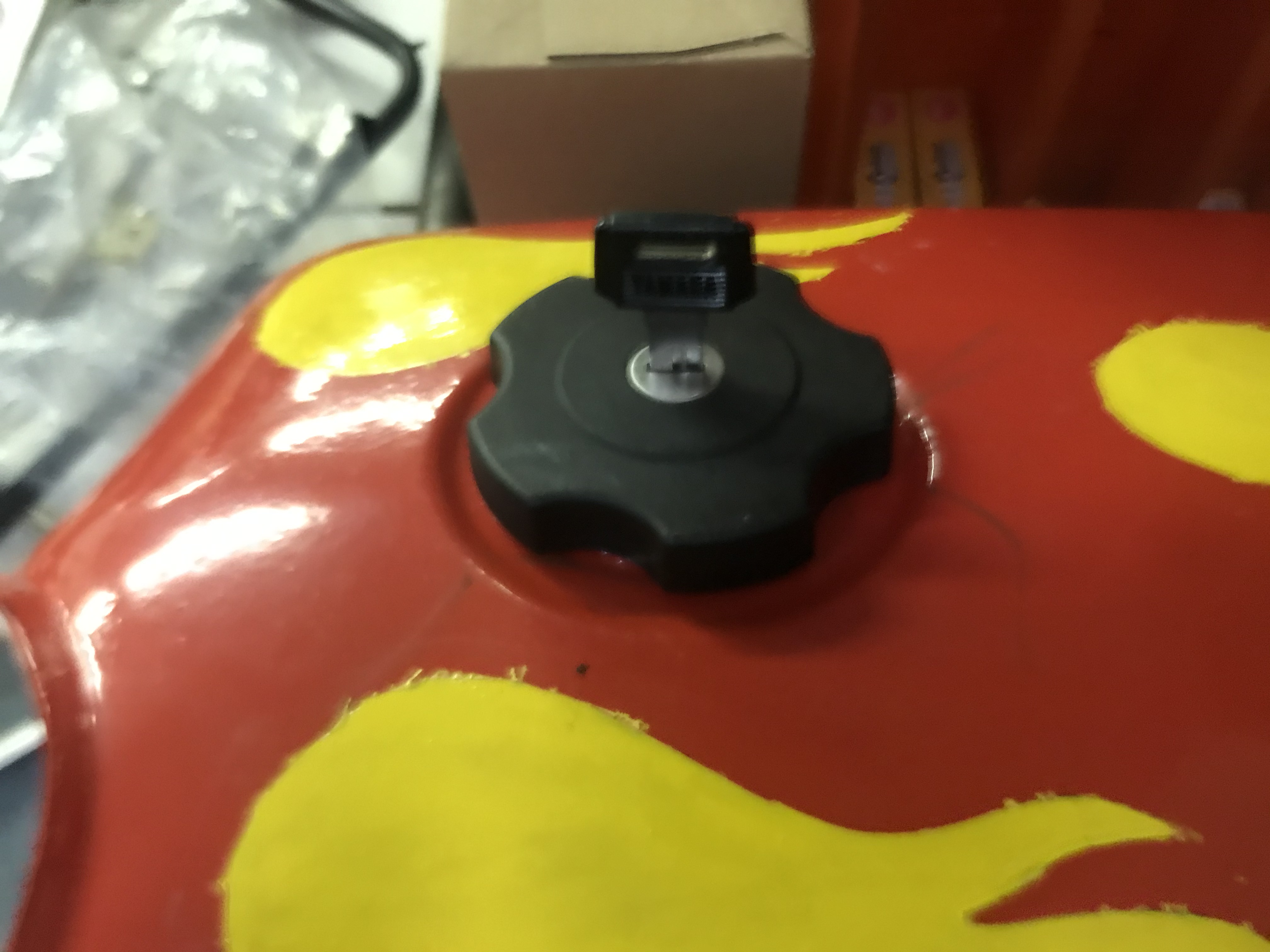 mit Benzinhan und Tankdeckel mit Schlüssel.